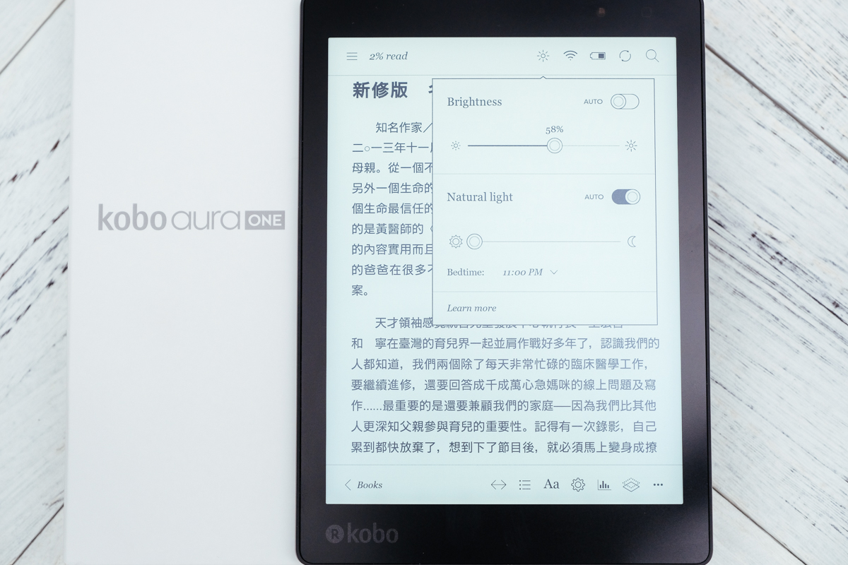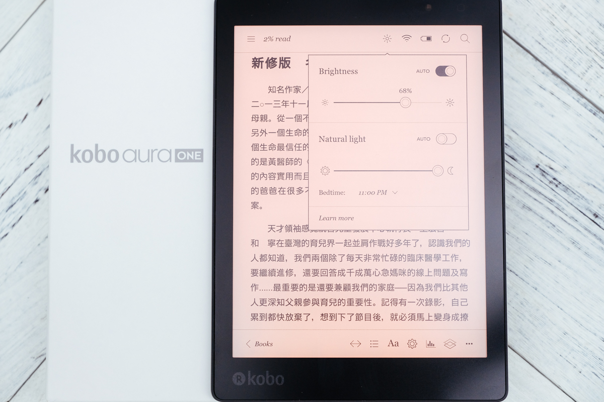 過了幾分鐘終於又回到阿湯的手上,E Ink 本身可以完全不發光,跟書本一樣倚靠環境光源來閱讀,當然也因應光線不足的情況下內建有背光功能,可以選擇自動或手動調整亮度,阿湯自己測試 30% 左右就夠在各種環境下使用,大家可以多調整看看。