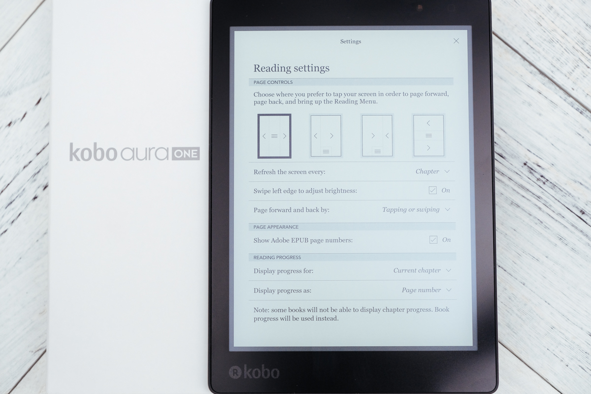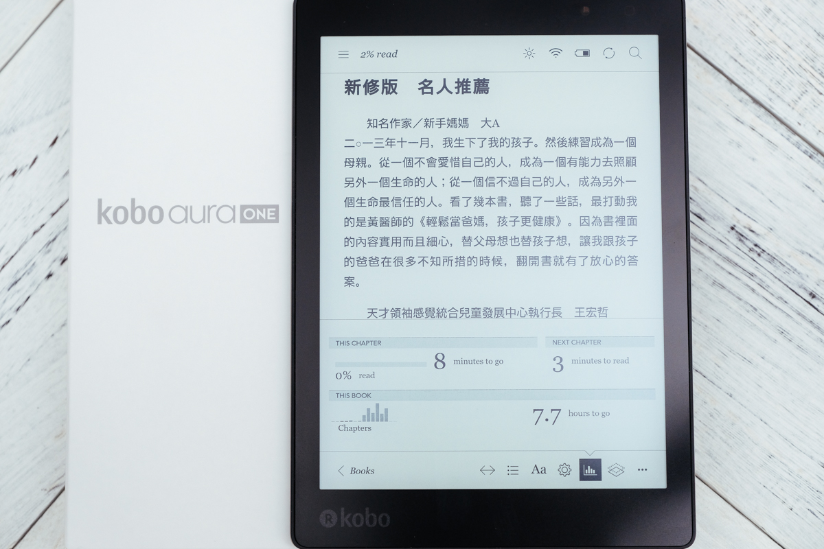 Kobo aura ONE 採用 7.8 吋 E Ink 觸控螢幕,解析度為 1872 * 1404(300 ppi),畫質非常高,雖然為 7.8 吋,但重量僅 230g,約是 1.5 支手機的重量,長期拿在手上閱讀還是算相當輕鬆的,不會覺得太負擔,另外螢幕的部份是全平面,蠻多電子書閱讀器的螢幕是內凹的,使用起來還是全平面比較好。
