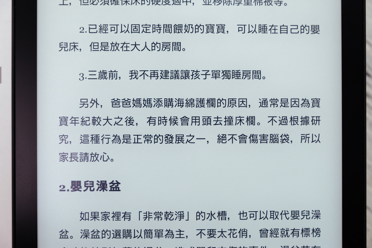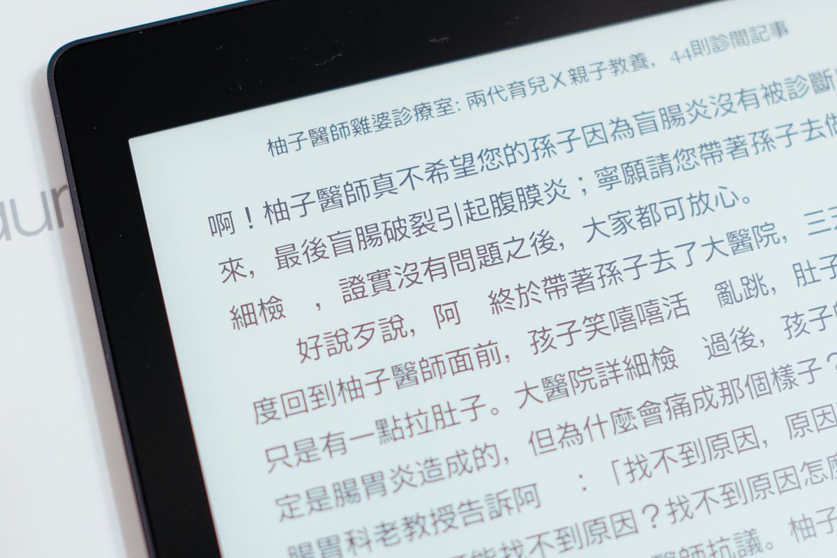 - 平板的文字顯示相較 E Ink 電子紙螢幕的清晰度較差,看久容易疲勞,也更傷眼睛