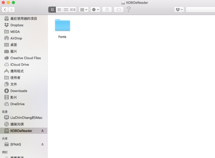 你的電腦會出現一個外接磁碟的顯示(名稱為 KOBOeReaer),在這裡面建立一個 Fonts 資料夾,名稱務必要打對,且資料夾要放在最底層。