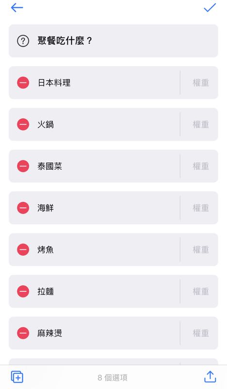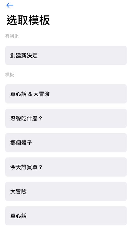 「小決定」主要是以轉盤的方式來幫我們做決定,而其中更是預設了大家常用的「真心話 & 大冒險」、「聚餐吃什麼」、「擲個骰子」、「今天誰買單」、「誰要做家務」、「今天做什麼運動」等常用選項來當模組,用戶可以使用原先預設的選項或是透過「+」來新增想要的選擇。