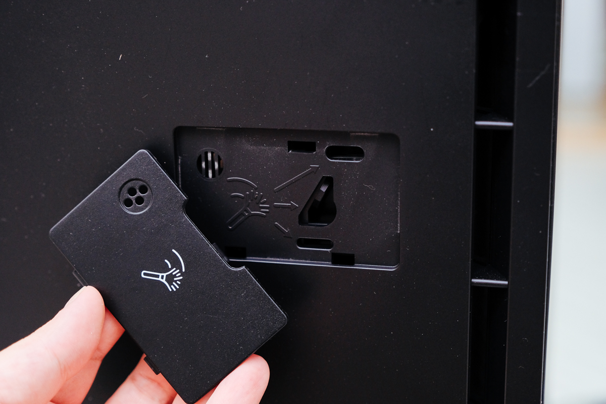 在前面看到側邊機身上有個小蓋子,上面還有個清理的小圖示,這裡是空氣的偵測器,除了常見的懸浮微粒之外,像是甲醛及其他揮發性有機化合物、家用異味等都可以偵測到,並進一步的自動調節運轉風速。