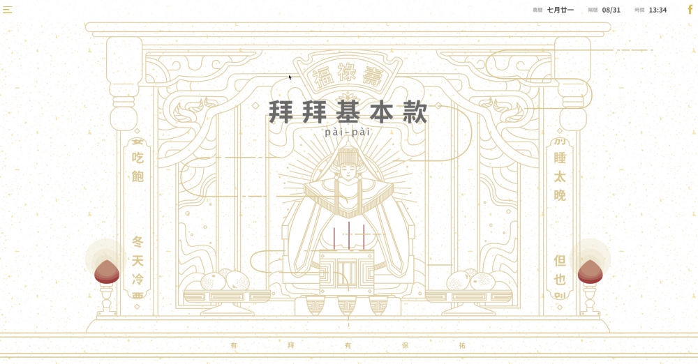 進入拜拜基本款的首頁,阿湯還沒看過這麼精緻有質感的「民間習俗」相關網頁,做的實在太好了,右上角會顯示當日的農曆日期、國曆日期以及當下的時間,以便讓你可以對照。