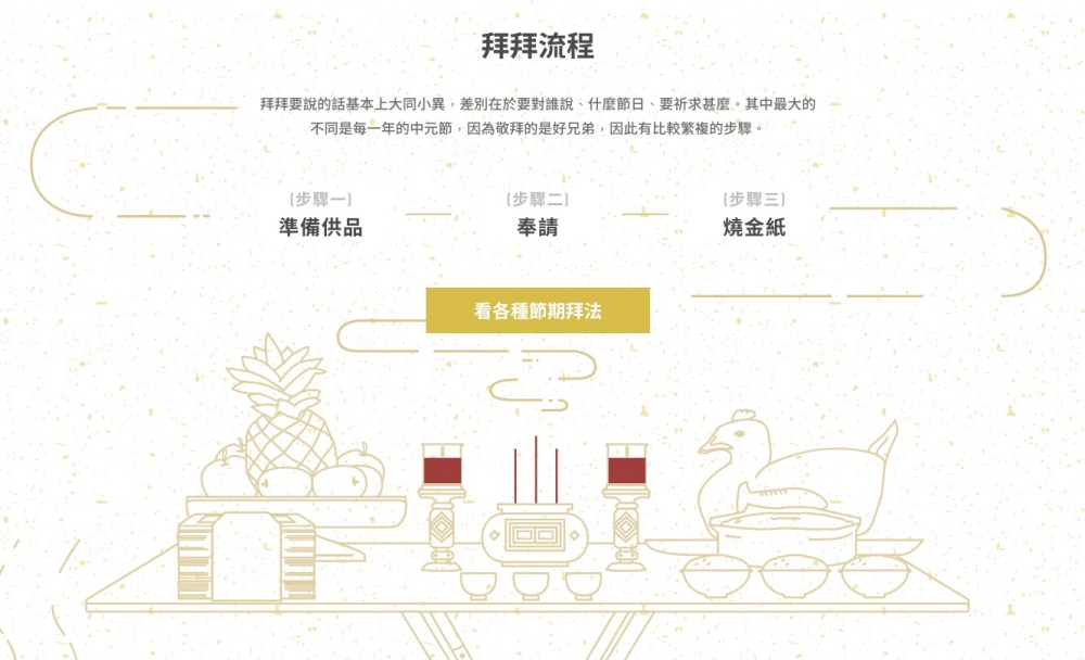 在首頁的最底下還有基本的拜拜流程,基本上不離三步驟:準備供品 => 奉請 => 燒金紙,其他則是每個節日有不同供品的需求,就要參考剛剛上面的資訊。
