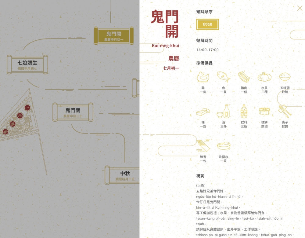 比如阿湯點擊鬼門開,這邊就會顯示更詳細的祭拜資訊,像是順序(有些節日不只拜一個對像),時間、供品以及祝詞跟金紙的準備通通都告訴你了,只要照著準備就絕對不會有錯。