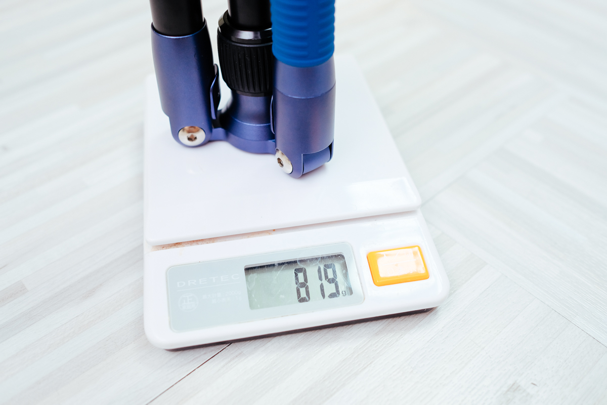 新買的腳架 MOMAX TRIPOD HERO TRS7 官方標示為 830g,我實際測試為 819g(含雲台),830g 應該是加上手機夾座的重量我猜。