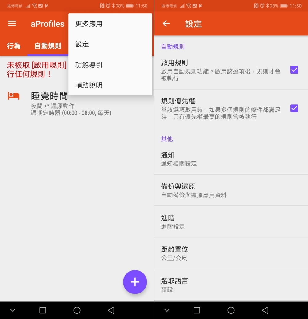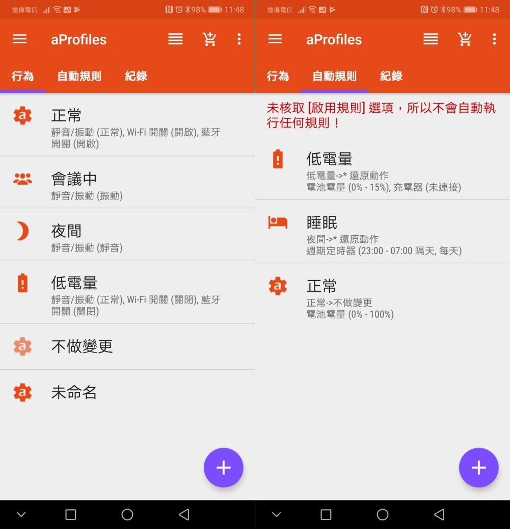 在 APP 的主要畫面上,我們區分為「行為」跟「自動規則」,簡來說,行為就是你想要執行的動作是什麼,比如開二個指定應用程式,關閉 NFC、開啟 Wi-Fi 等,都可以依自己的需求同時設定多種執行需求;而自動規則就是可以設定達成什麼樣的條件時自動執行你設定的某個行為,當條件不滿足就回復原狀,或者執行另一個設定行為。