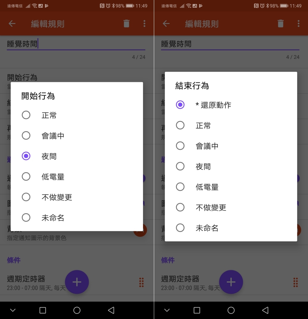 然後設定開始跟結束的行為,當規則執行期間,阿湯選擇夜間,也就是滿足條件(後面會講)時手機就會進入靜音,而結束行為是選擇還原動作,也就是當條件不滿足時就會回復原本的設定值。