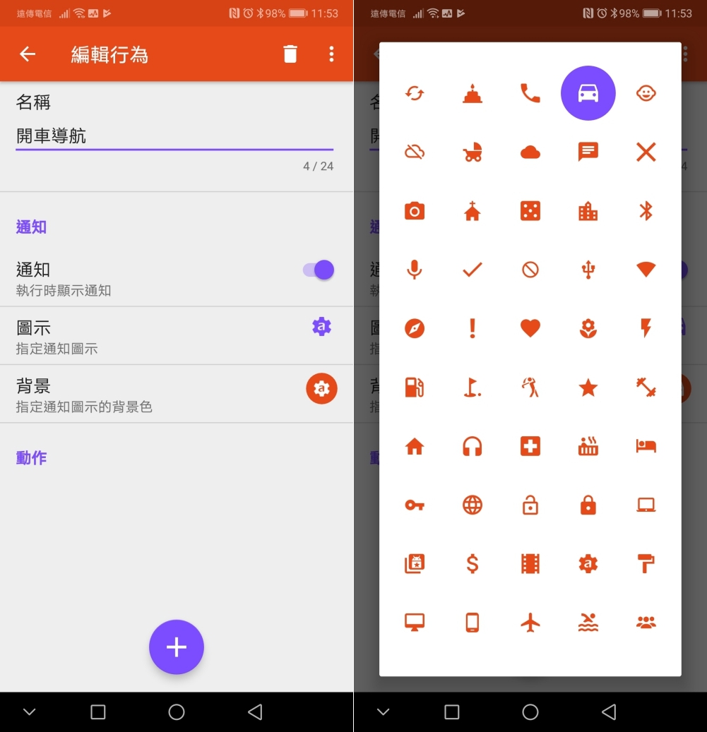 這時我們只要建立一個新的「行為」,比如命名為開車導航,目標是想要同時開啟二個 APP(Google 地圖跟測速照相),內建的圖示也有不少可以選擇。