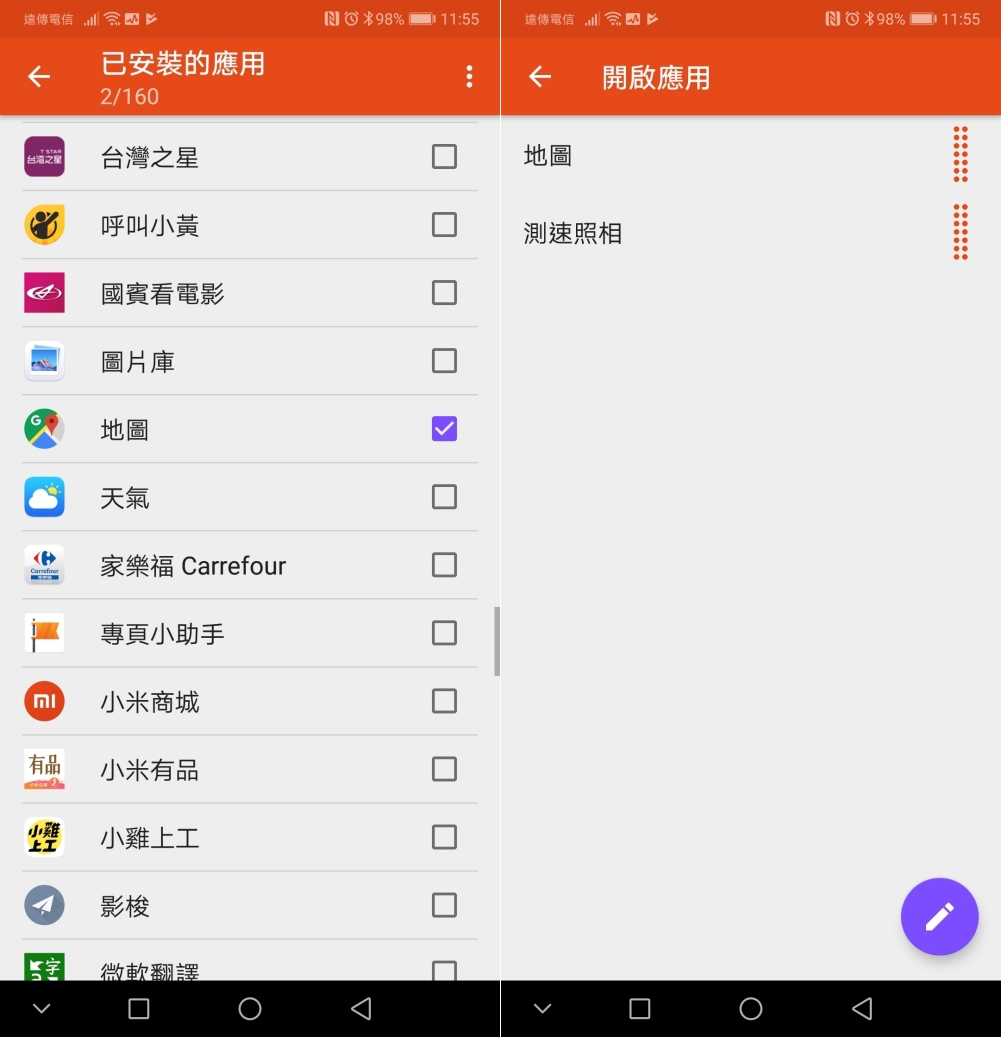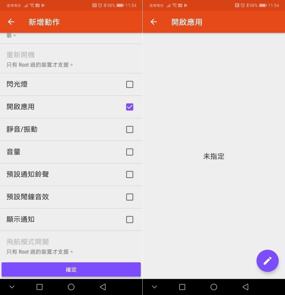這邊順帶一提,可以新增的動作非常多,大家就自行慢慢看,部份動作是礙於安全權限的關係,必須 Root 才能使用,不過大部份的功能應該已經讓我們生活應用綽綽有餘了,阿湯這次要設定的是同時開啟二個 APP,所以動作我選擇開啟應用,確認後就可以按下編輯圖示來選擇應用程式。