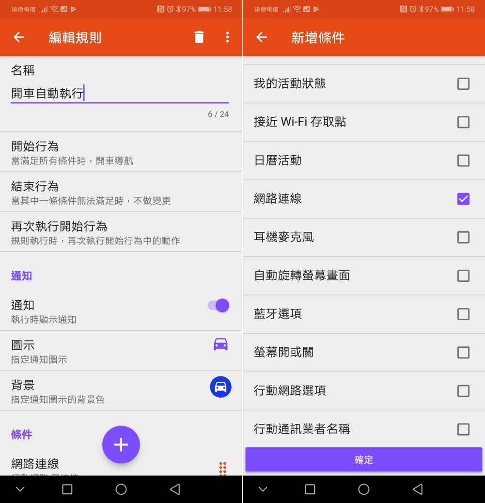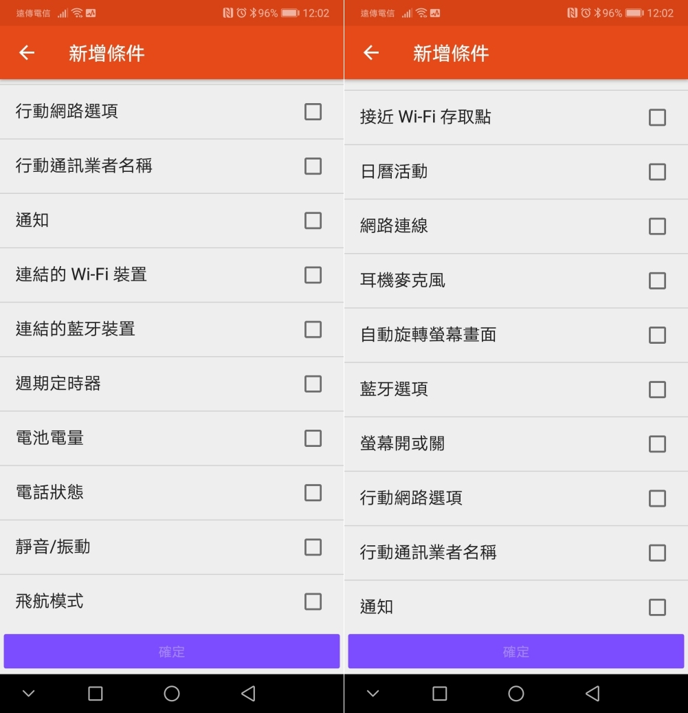 自動規則的可設定條件非常的多,可以偵測 NFC 標籤、Wi-Fi 基地台、行動網路(甚至是通訊業者名稱),藍牙裝置、充電器、電量、地理位置、耳麥、日曆等,應有盡有,大家可以依照自己的需求來設定條件。