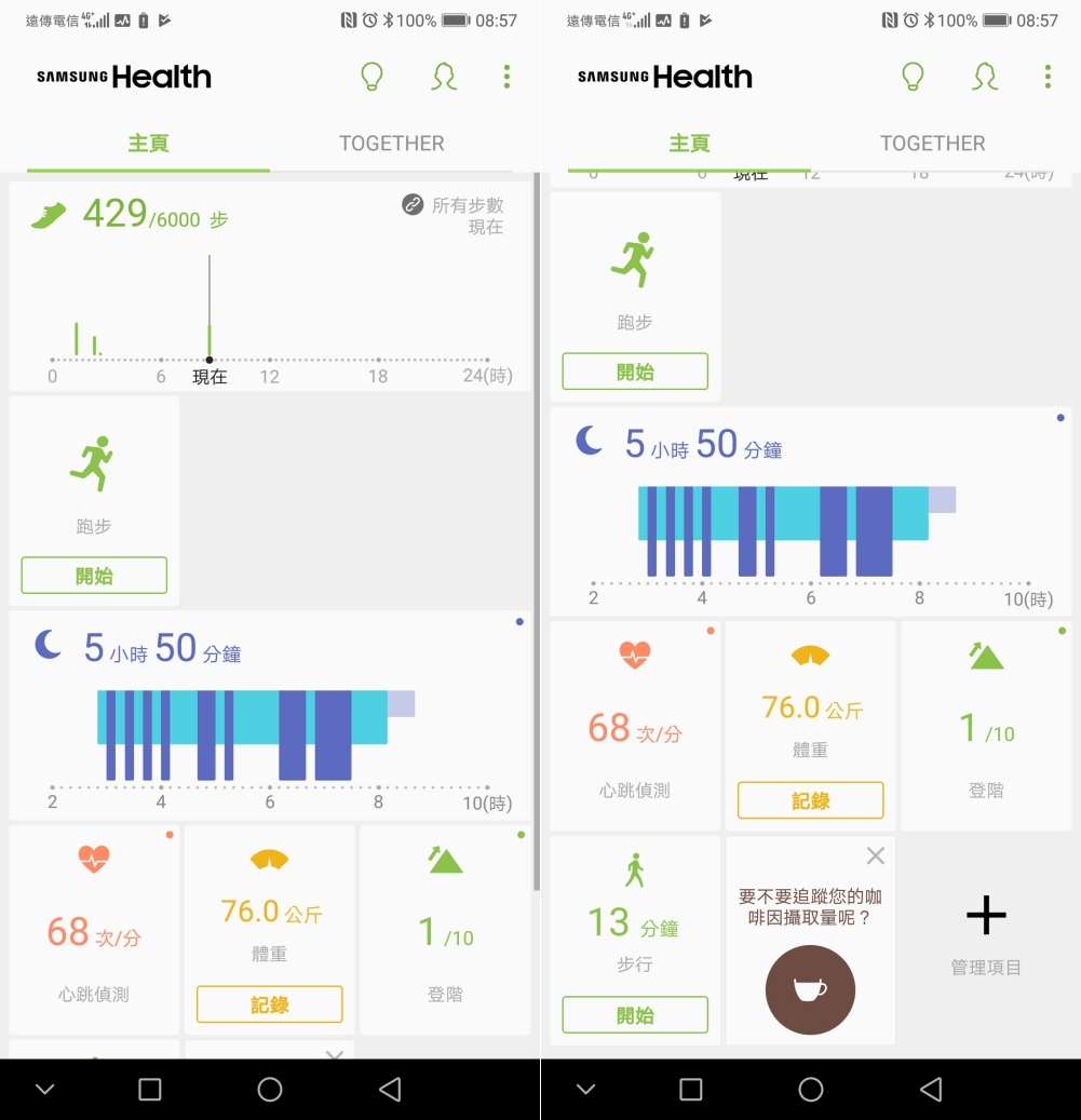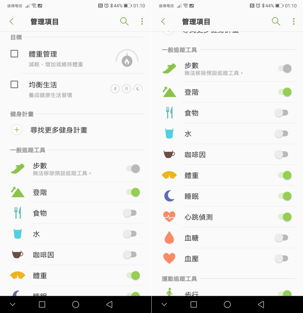 可以看的項目還有很多,還內建有追蹤工具,像是讓你記錄食物、喝水量、咖啡咽等。