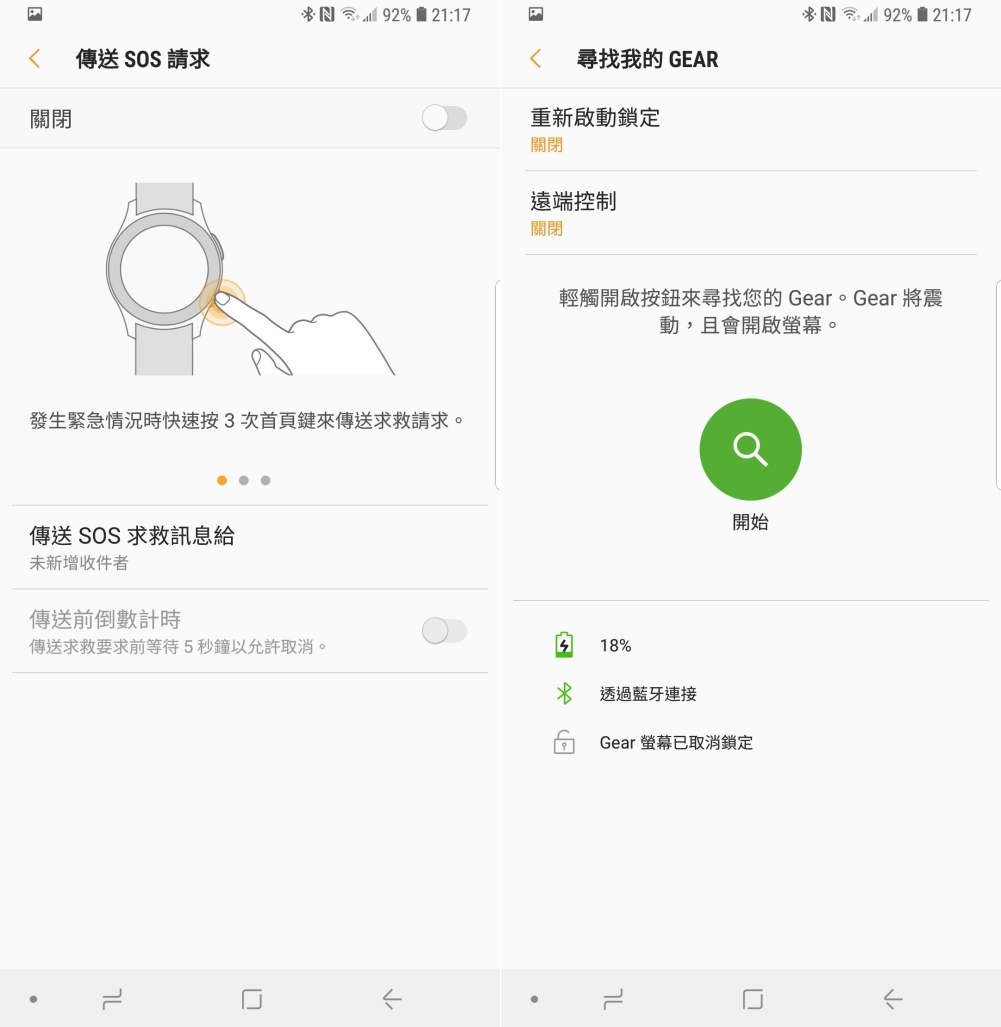 Gear Sport 的右下角按鍵,如果有需要的話也可以開啟 SOS 請求,只要按三下右下角的鍵就會自動發送 SOS 訊息到你設定的聯絡人,如果家中是給小朋友戴錶這也是很不錯的選擇,教小朋友遇到危險時可以透過這樣的方式立即通知。