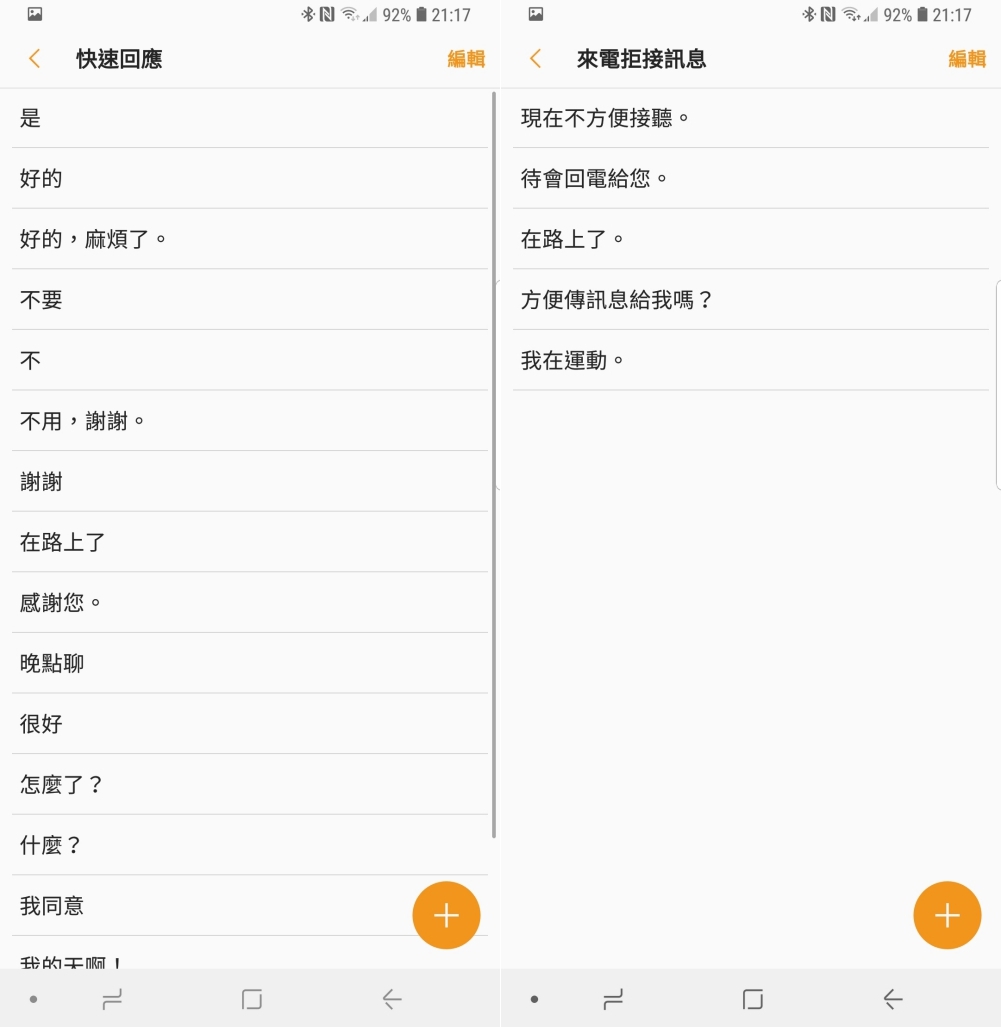 平常也可以設定一些快速回覆用的罐頭訊息,包括電話來時如果無法接聽,可以預設一些訊息來使用,以便拒接後可以快速傳送訊息給對方。