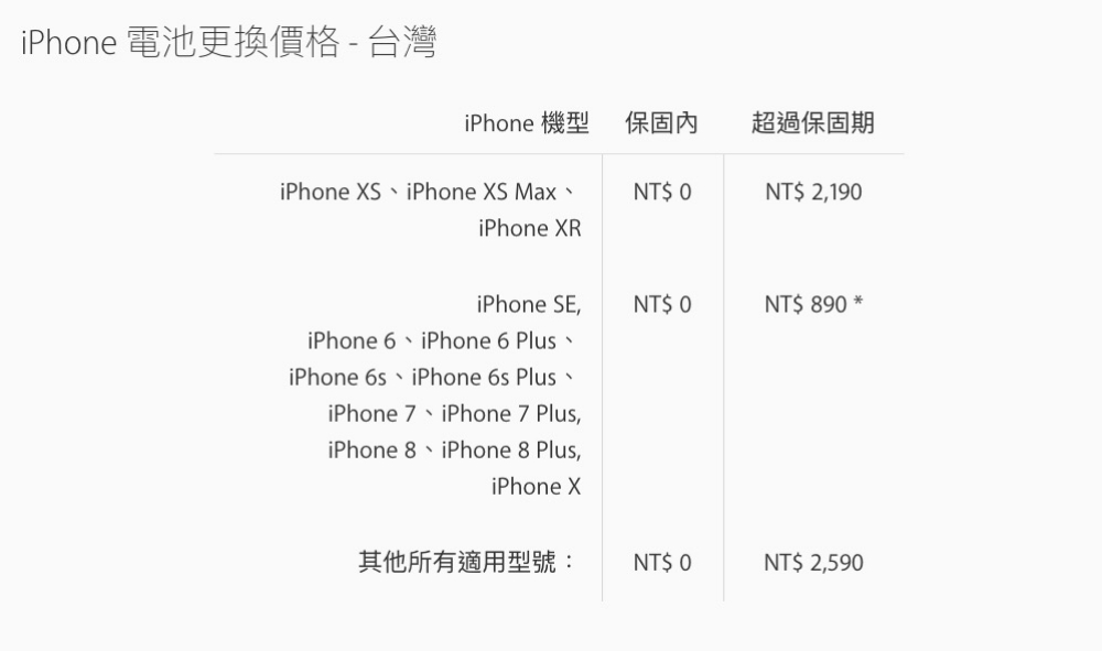 我們直接來看一下更換電池的方案,基本上只要在保固內就是不用錢,只要健康度不 OK,隨時拿去換,千萬別浪費了保固期限,而超過保固之後,除了最近要上市的 iPhone XS 跟 XR 之外,從 iPhone SE 開始的型號 ~ iPhone X 一律都是 890 元,算是蠻划算的,而舊機的型號沒在列表上的超貴要 2590 元,還是去找副廠吧。