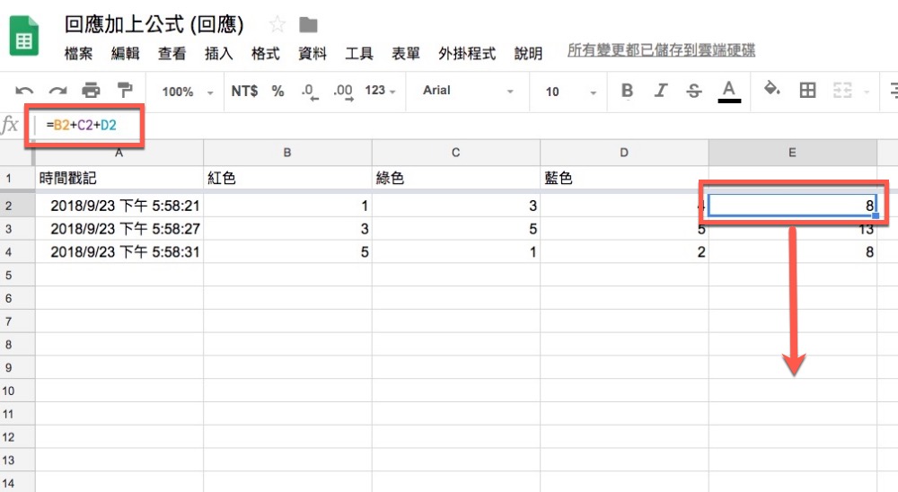 當有人在 Google 表單填寫內容後,你可能也會想在試算表這裡直接加上公式進行統計分析,照一般的試算表方式來說,我們只要在最後一行加上要使用的公式後往下拉就可以快速延伸到每一行。