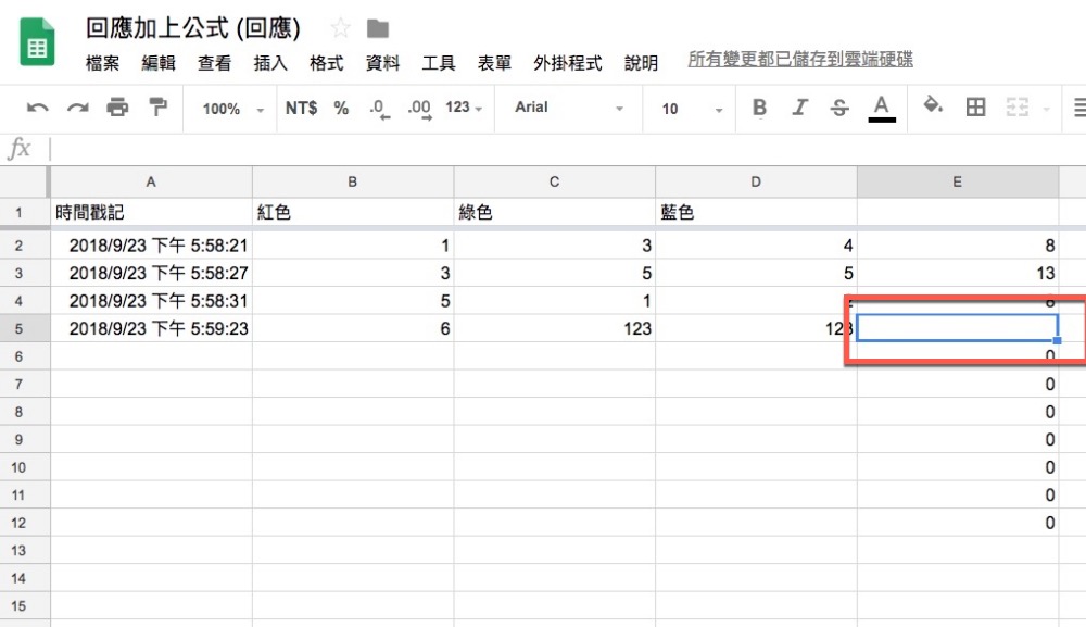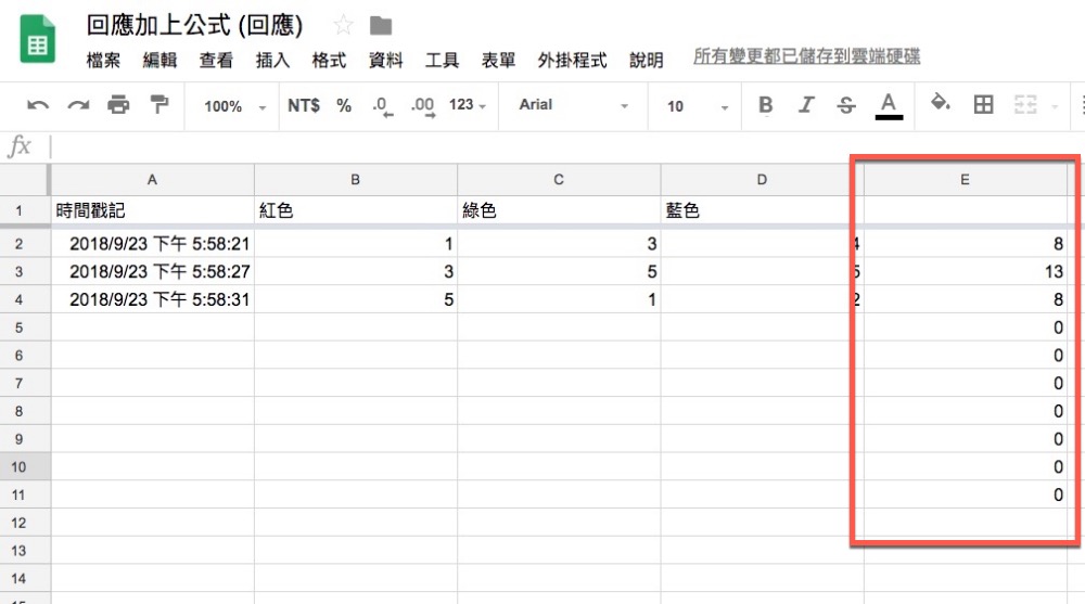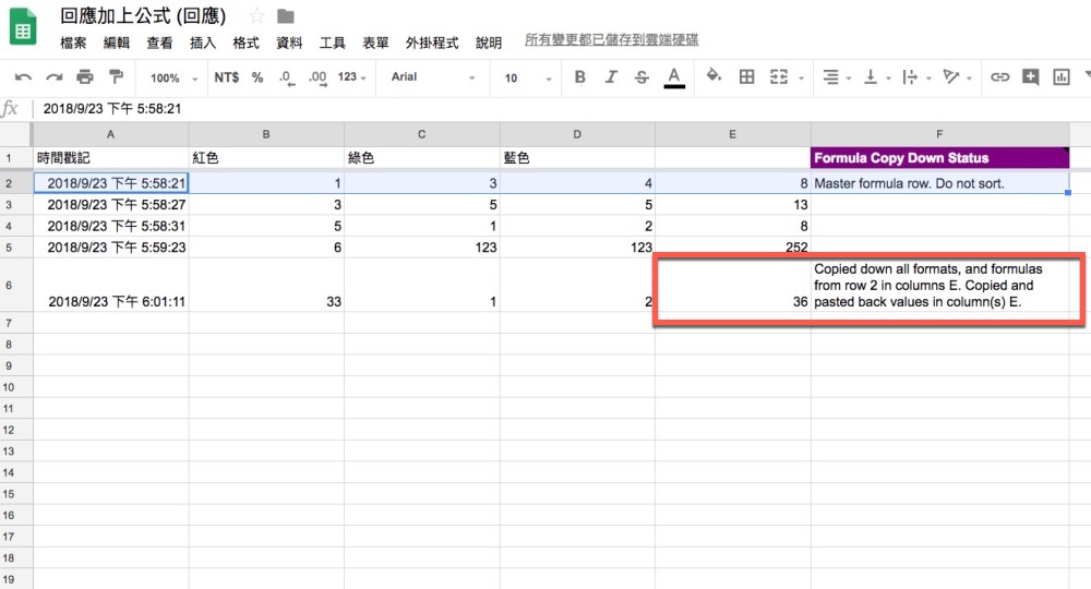 然後再去表單試著送出內谷看看,你會發現新的回應開始,會自動套用第一行的公式了,而預留行出現的內容你可以事後自行刪除不影響。