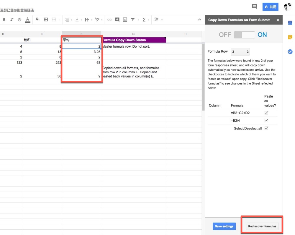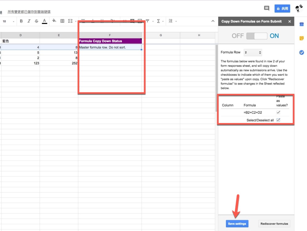 接下來會出現這樣的畫面,在你回應表單的最後一行再加入一個 copydown 的預留行,右邊的框框裡會自動檢測到你設定在回應之後那行的公式,勾選起來後,按下 save settings.