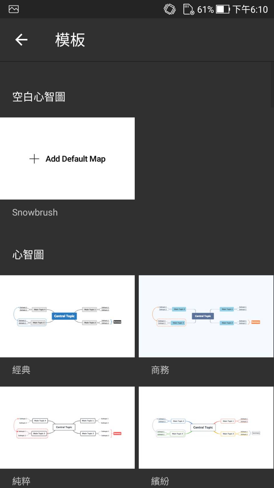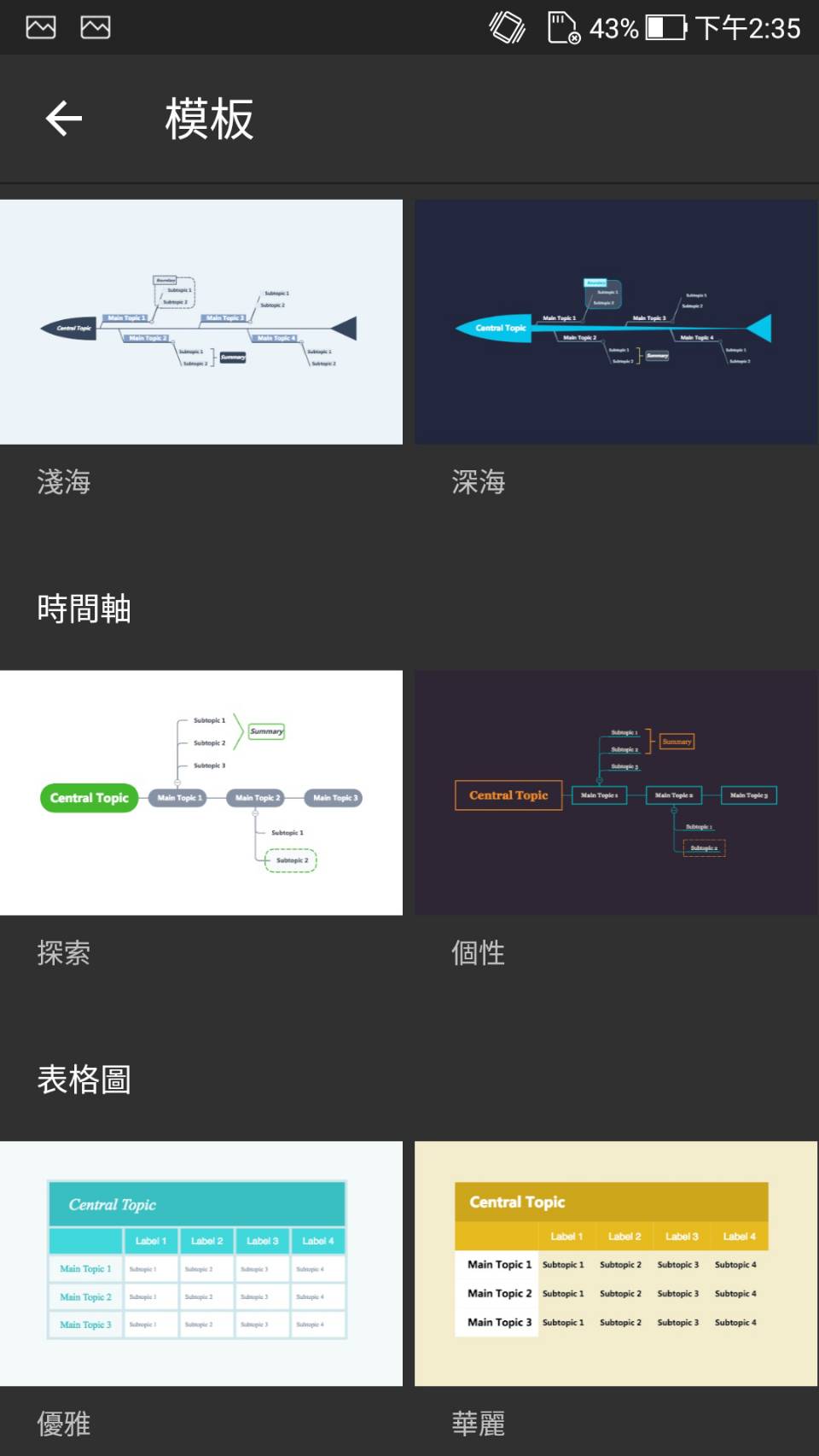 往下拉,XMind APP不只可以製作心智圖,還可以製作組織圖、邏輯圖、樹狀圖、魚骨圖、時間軸、表格圖等等,相當方便。