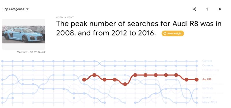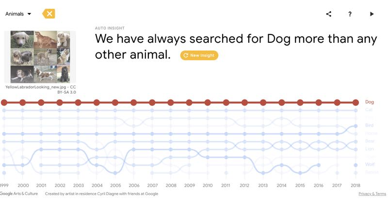 因此透過這份曲線圖我們就能知道哪些話題是在什麼時候突然竄紅,或是哪些話題在這 20 年裡根本就是一支獨秀的稱霸最熱門 Top 1(例如狗狗!)。