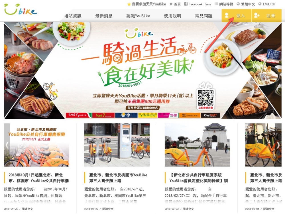 YouBike 官網,點擊右上角的登入,登入自己的帳號。
