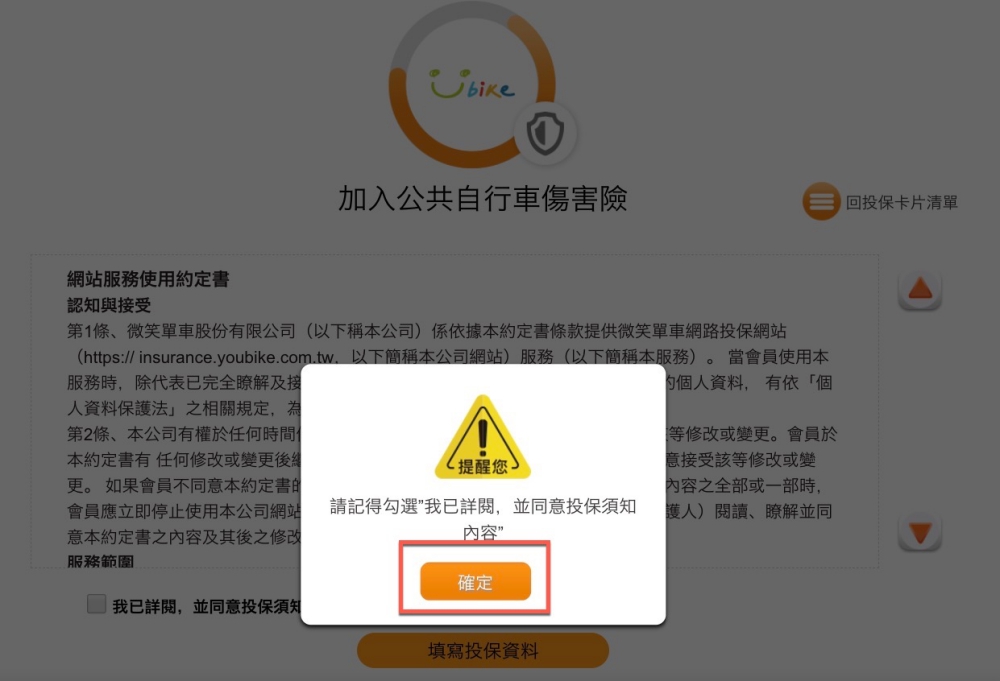 一登入就會跳出提醒詢問你,是否要加入公共自行車傷害險。