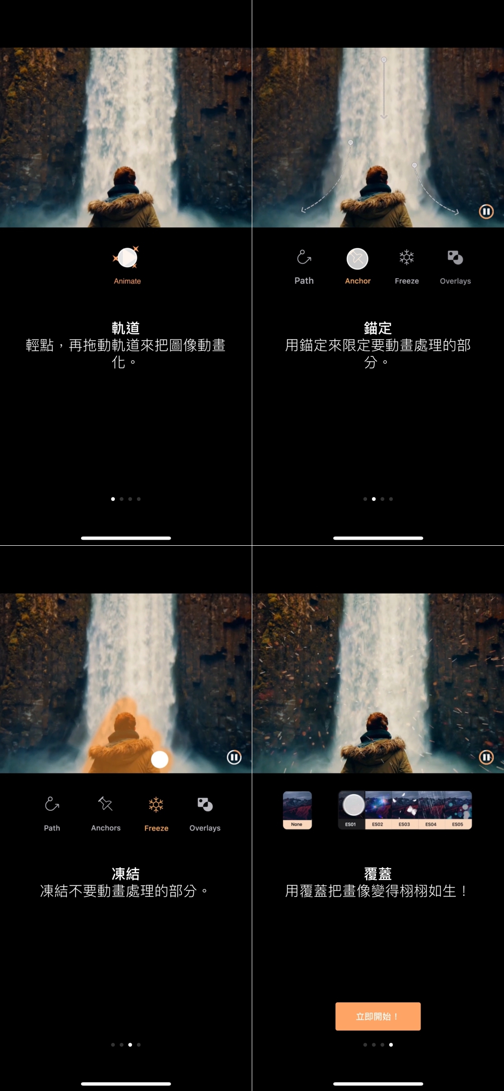 安裝完 APP 一進入就有最基本的使用教學,分別是設置軌道、錨定及凍結,覆蓋只是讓畫面更多特效,看你要不要弄都可以。