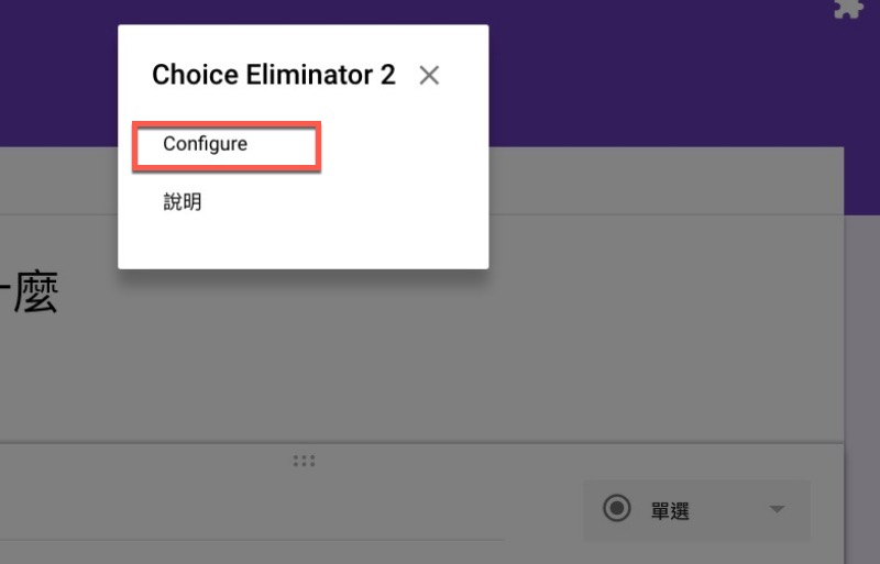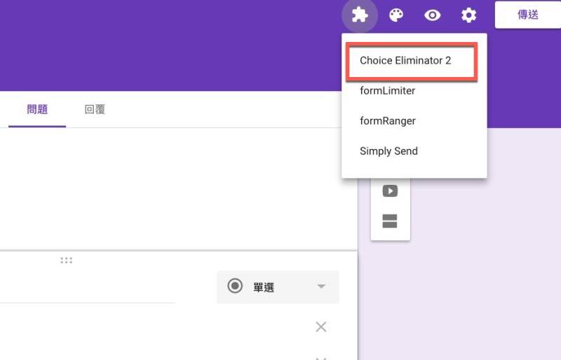 在設計 Google 表單時,右上角外掛程式裡就可以看到多了一個「Choice Eliminator 2」可以選擇。