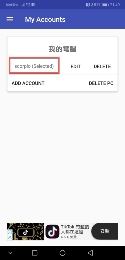 接下來進入 My Accounts 會看到我們剛剛加入的電腦,按一下 Add ACCOUNT。
