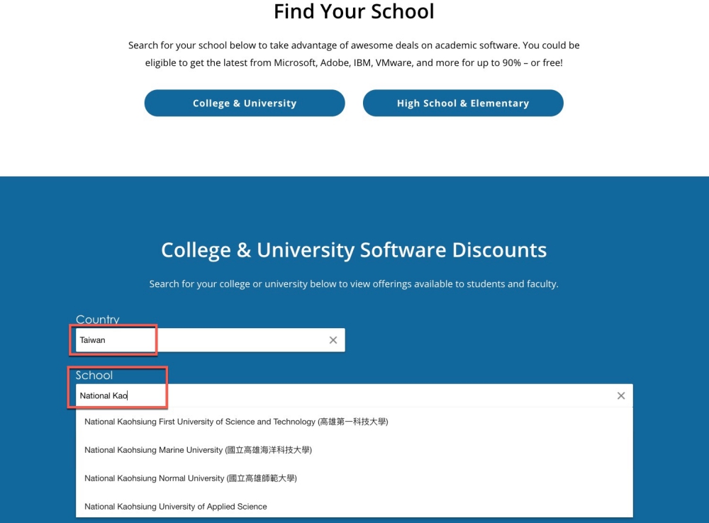 阿湯不太確定是否全部的學校都有,所以你要先搜尋看看,但我查了大約 7~8 間台灣的大學都找的到,在 Country 的地方先輸入 Taiwan(如果是國外的學校也可以),School 就輸入你的學校英文全名,找到你的學校,記得不能輸入中文或英文簡寫,那都會找不到的,阿湯這邊是向網友借到的高師大帳號,所以我用高師大來做範例介紹。