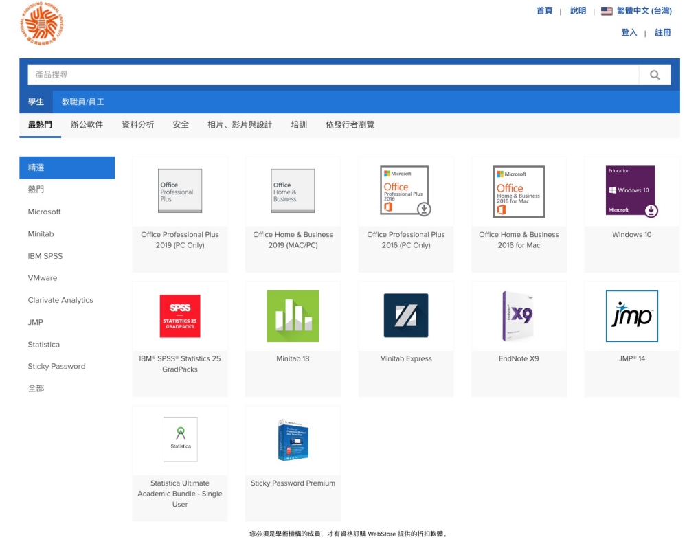這麼一來就會進到你的學校專屬的區域,可以看到有提供哪些軟體可以下載使用,阿湯是建議也不用急著全部免費的都一次下載,有需要時再來取得序號也行,我們可以先隨便點擊一個進去看看,比如 Office Professional Plus 2019。