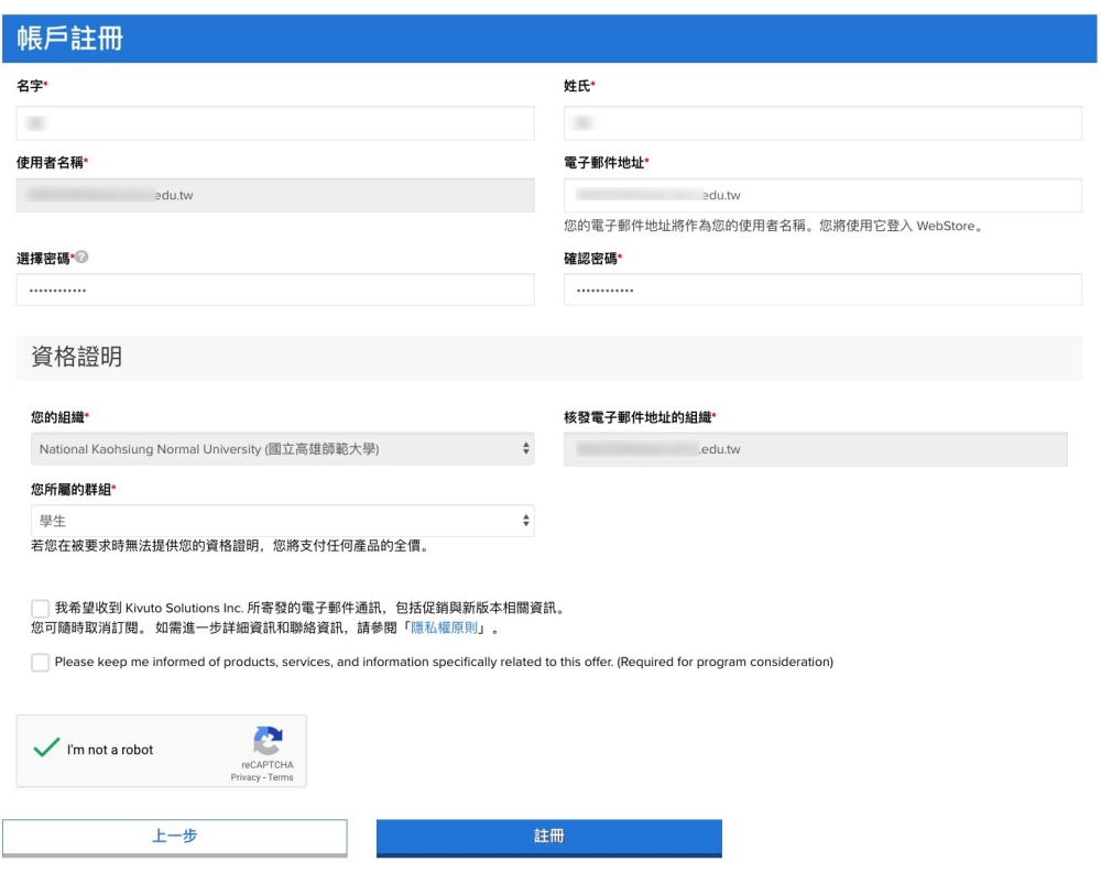 雖說是註冊,不過不會要求什麼個資,這個流程最重要的就是驗證你的學校信箱,這邊第一個請先輸入你的學校信箱,不是的話是無法通過驗證的,因為還要收驗證信,學校信箱一定會包含 edu 這幾個字。