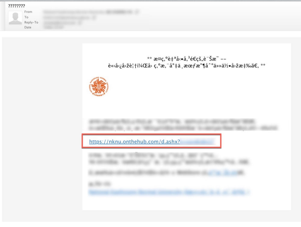 很多學校信箱如果還沒有結合 Gmail 的,自家信箱通常編碼亂的有一堆,像高師大的學校信箱收到時是亂碼,不過沒差,就是點擊信件內第一個連結就對了。