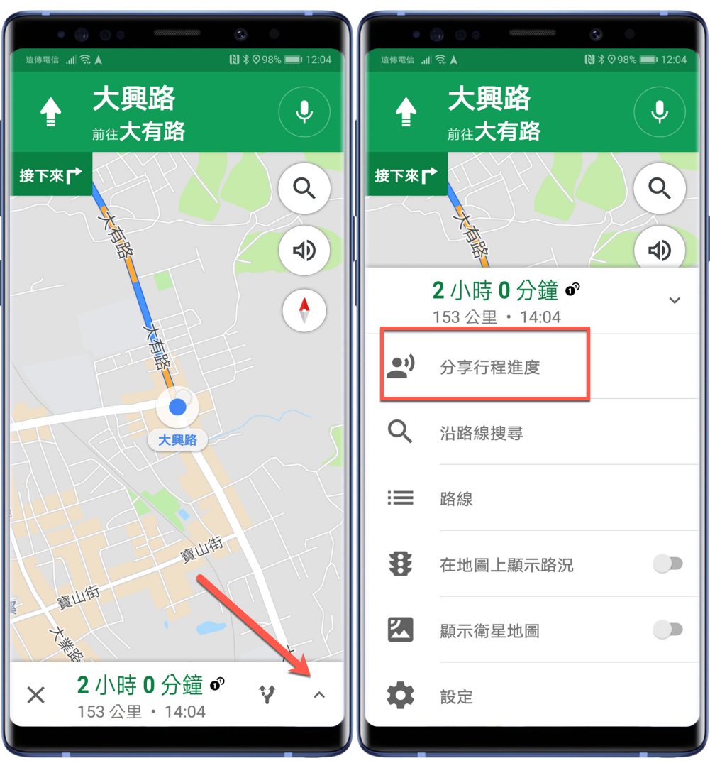 首先,設定好要出發的目的地,並進行導航,點擊右下角的選單後,就會看到「分享行程進度」可以選擇。