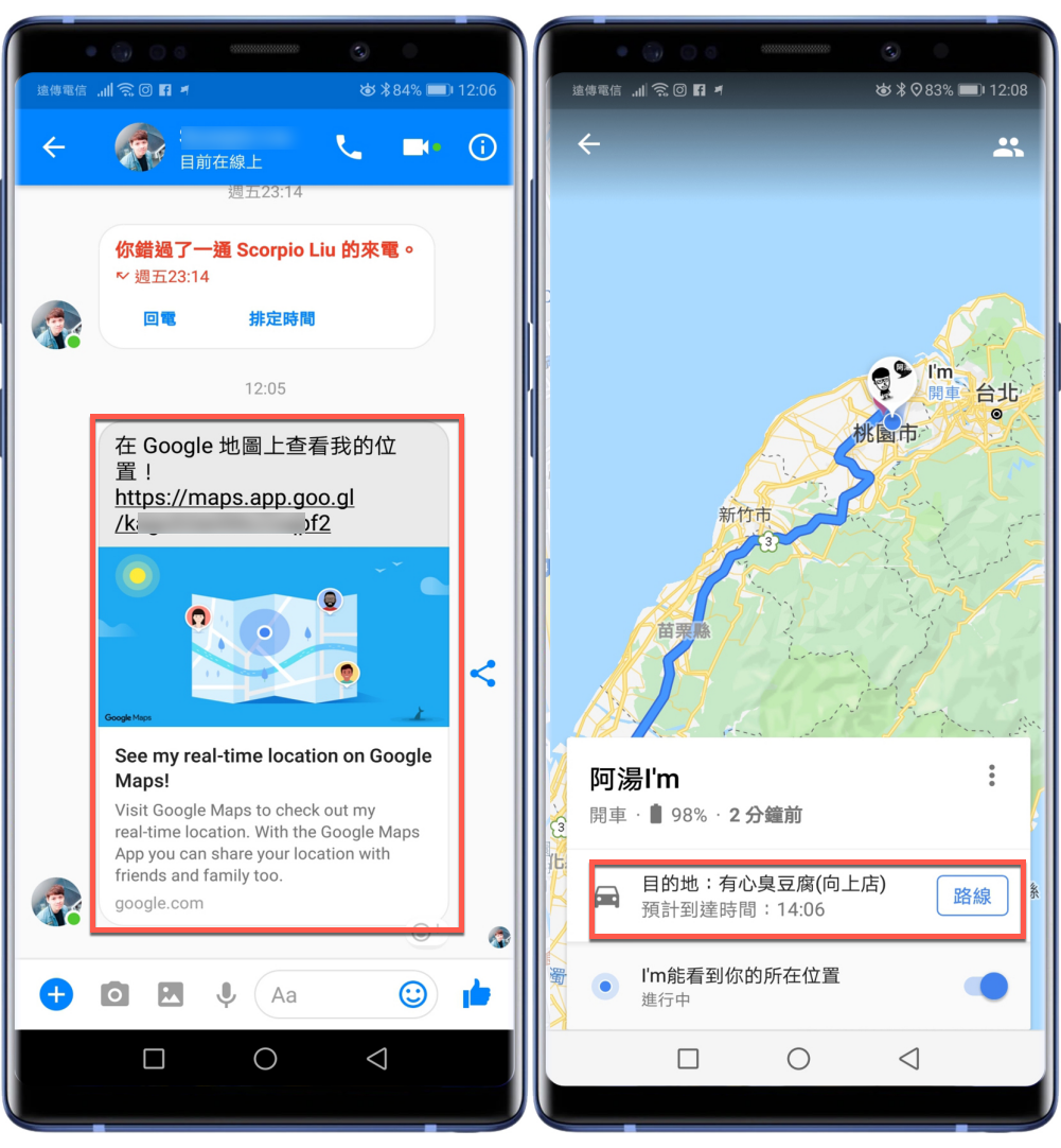 這是別人收到的畫面,點開網址後就會透過 Google 地圖開啟,即時的看到你目前的位置,開啟的人可以選擇是否同樣要分享位置給對方,或者單純的追蹤對方的位置就好,按下路線後就可以同步的進行導航到目的地。
