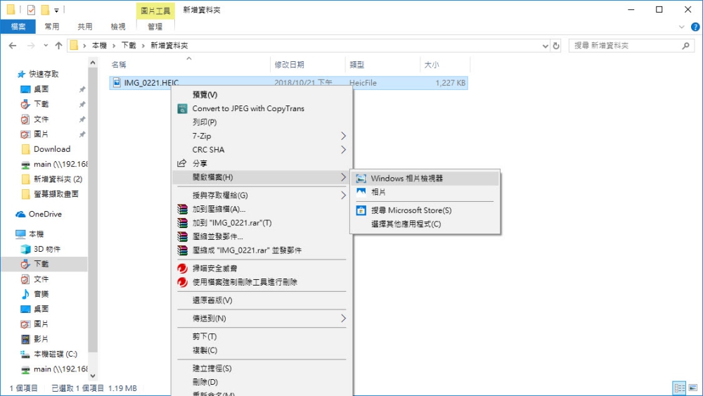 另外如果你要將 HEIC 的照片轉檔為 JPG 的話,也只要在照片右鍵就可以看到「Convert to JPEG with CopyTrans」,按下去就會在同資料夾中轉存另一個 JPG 檔案了。