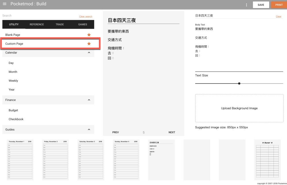簡單的講一下介面操作方式,左上角是可使用的模板,下方八頁可以自由點擊切換要編輯哪一頁,每一頁可以手動輸入的內容會顯示在右上角區塊,但大部份的空格是無法事先編輯的,必需印出後自行手寫,當然你也可以全部都用空白頁自己打字或是 Custom Page 來輸入內容。