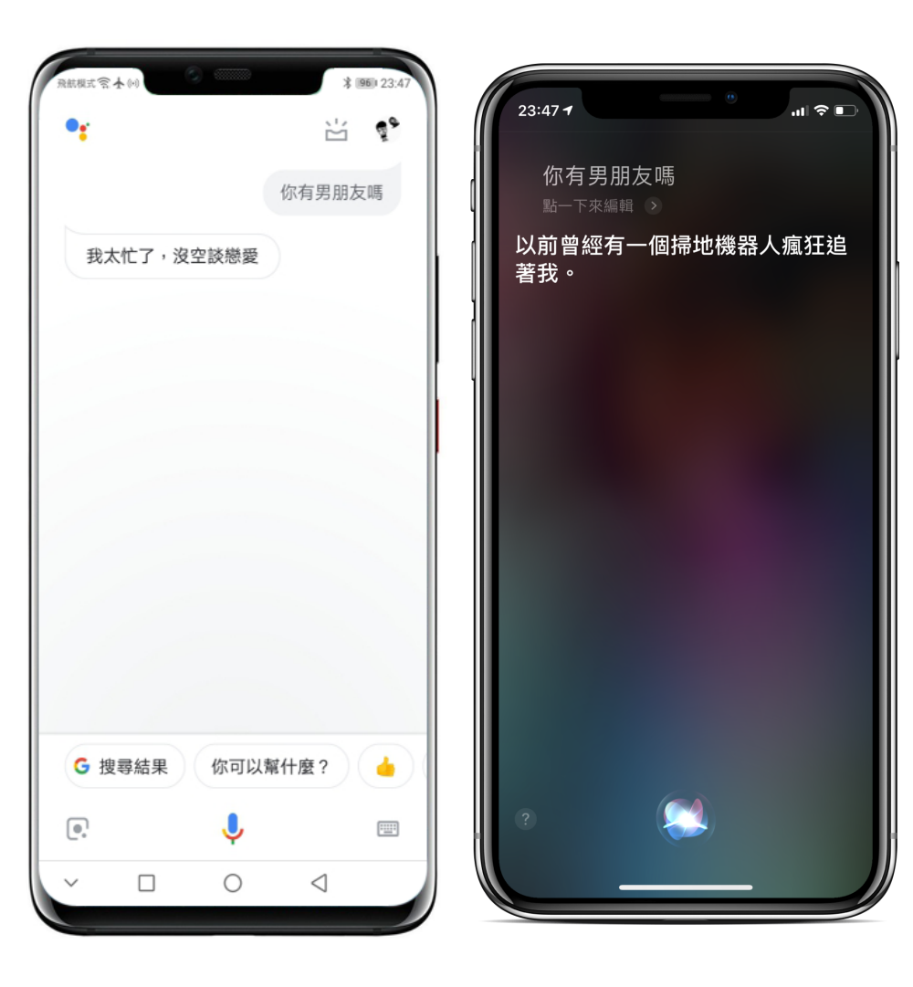 Google 清一色回答太忙沒空談戀愛,而 Siri 大概有 2~3 個答案重複(但我想知道是哪一家掃地機器人追著 Siri 跑)。