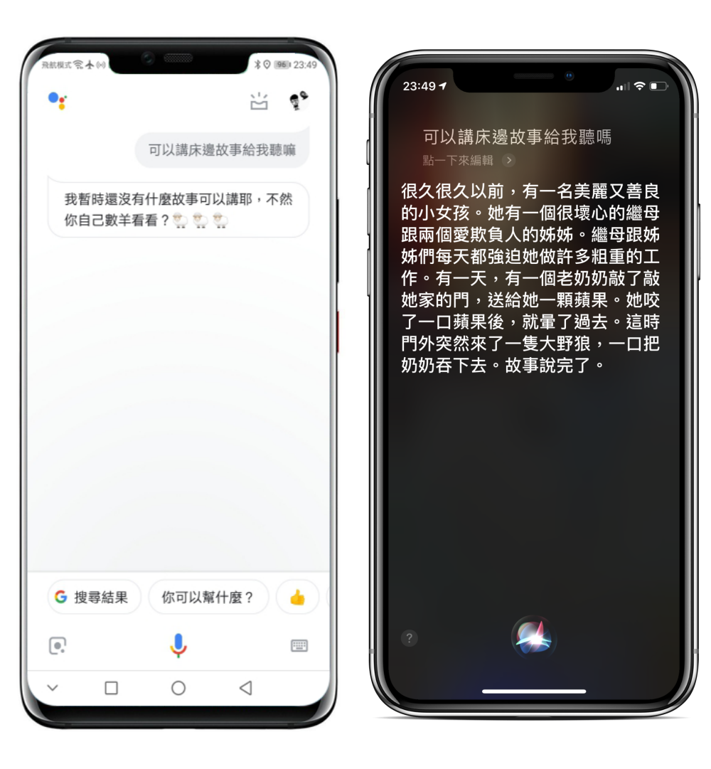 小孩哄睡時最需要的床邊故事,Google 雖然還沒有資料,但至少聽的懂,相信未來會加入床邊故事,而 Siri 在講故事方面真的是無人能敵,很會講。
