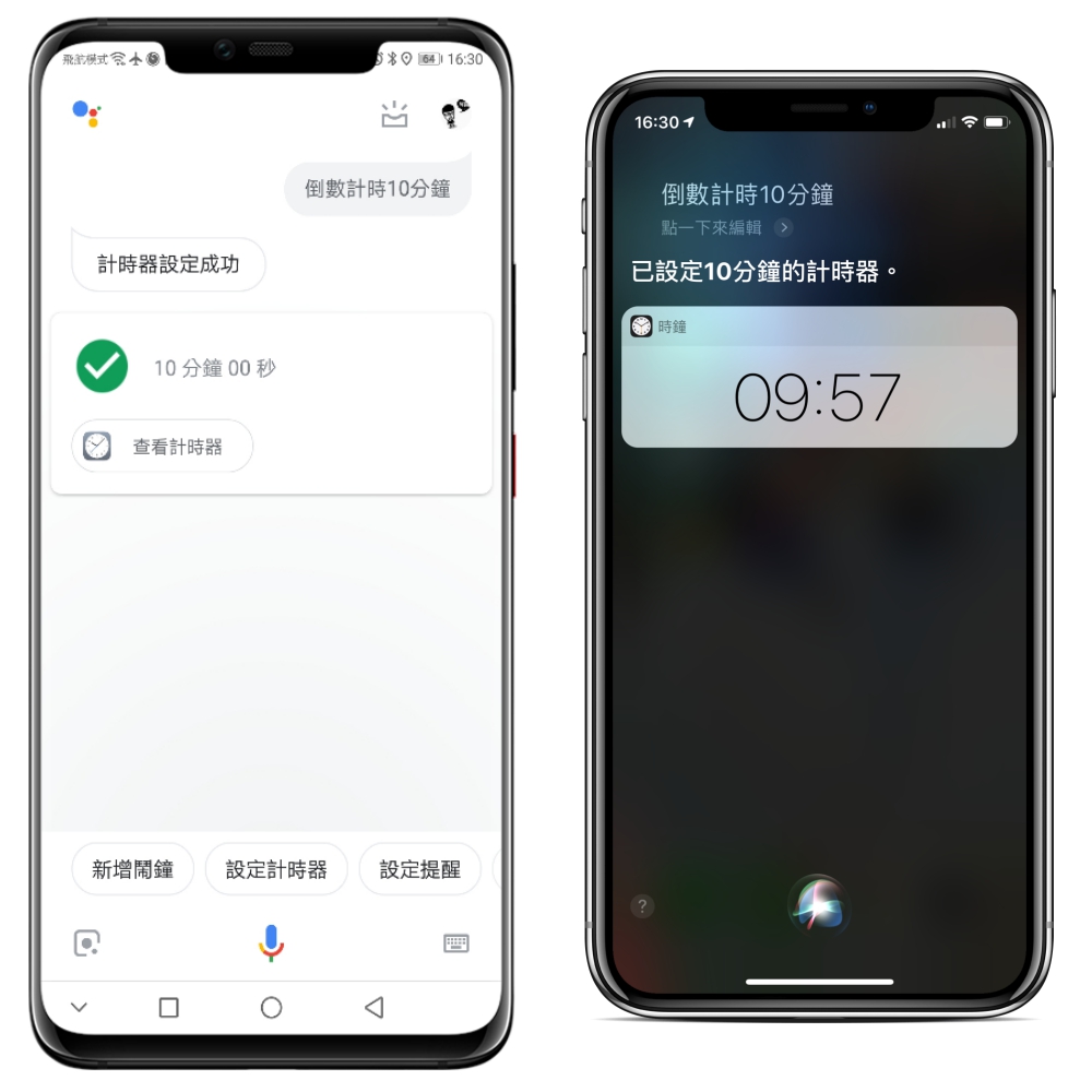 計時器的部份也沒有太大問題,你可以講倒數計時 X 分鐘,或簡短的講計時 X 分鐘都可以,不過當計時器正在執行時,如果你再講出計時 X 分鐘的指令時,Google 會直接覆蓋現有的計時器,以新的計時器開始,Siri 則是會先詢問你是否要替換目前的計時器。