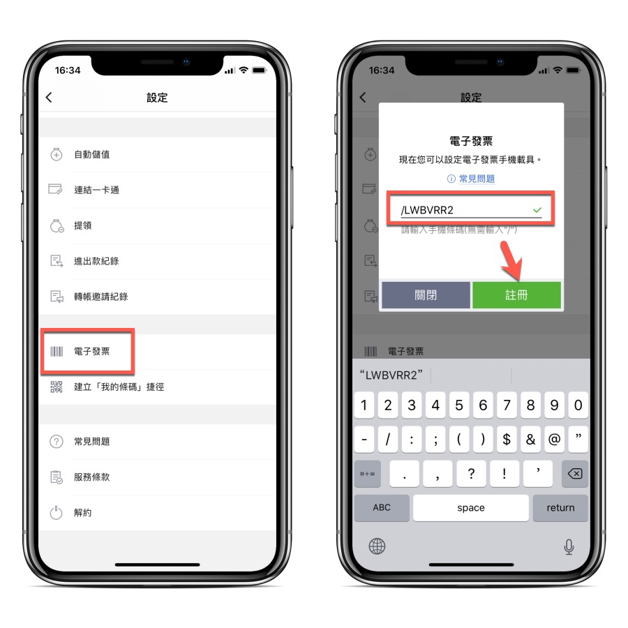 在設定裡就會有「電子發票」這個項目,點擊後就可以輸入我們前面看到的手機條碼,再按下註冊後就完成了。