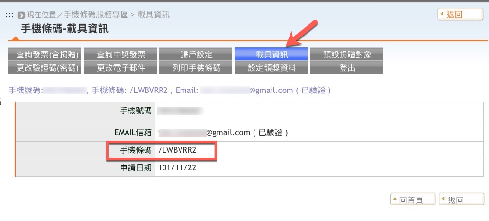 申請完後,可以在載具資訊這一頁查看你的手機條碼,然後就可以到你手機上的 LINE 去進行設定囉。