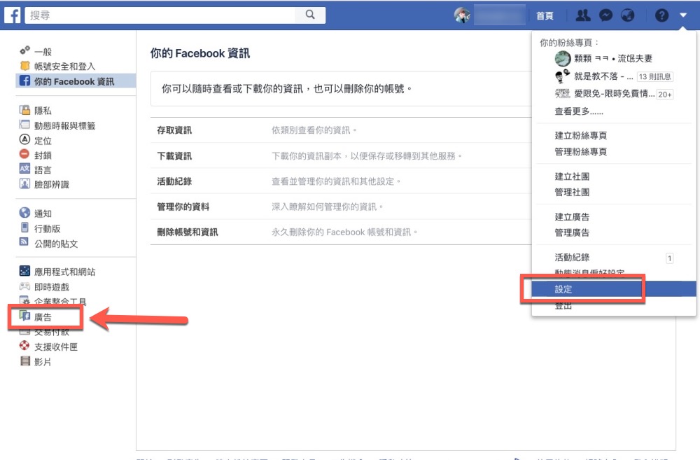 首先在右上角的選單下拉後進入「設定」,再點選左邊的「廣告」。