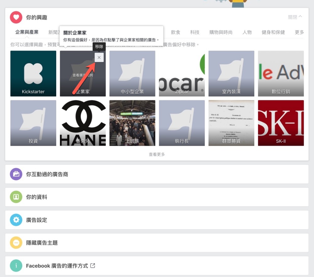 以興趣來說,主要都是針對你點擊過的廣告就會納進來,就算是誤點也算,所以常都會跳出一些其實你沒興趣的內容給你,這時你可以瀏覽一下,如果有你沒興趣的,可以按移除,移除後不需要按儲存,直接按 X 就可以。