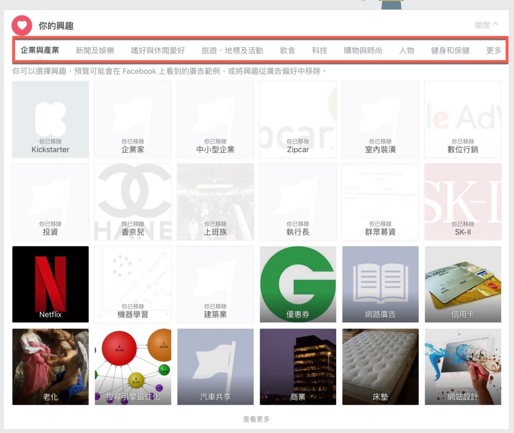 這邊開始就會看到你的興趣、你互動過的廣告商等。