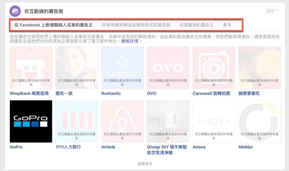 另外你互動過的廣告商,主要是針對廣告主用聯絡人名單來刊登廣告,簡單的說就是透過 Email 來刊登,這些 Email 可能是你註冊他們會員所取得,或者你曾經玩過什麼 Facebook 互動的遊戲之類的,都有機會被拿去利用來投放廣告,在這部份你可以選擇你沒興趣的廠商進行隱藏。