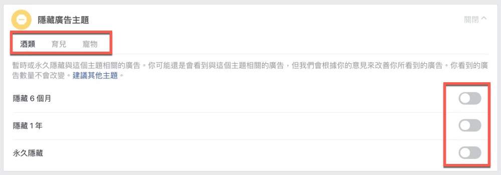 最後就是隱藏廣告主題,目前有三個類別可以選擇,分別是酒類、育兒及寵物,如果有你完全不會想看的,可以直接永久隱藏哦。