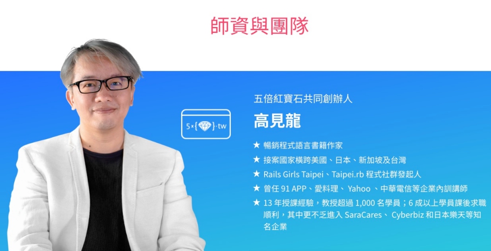 阿湯自己的寫程式能力並不是非常強,PHP 跟 Javascript 剛好都略懂略懂,因為我單純因應需求自己從網路上學了要用到的部份,從來都沒上過任何課程,最近在網路上看到一個學 Ruby 程式的線上課程的消息,對於 Ruby 這門程式完全沒有概念,不過看完介紹影片後發現 Ruby 好像很容易上手,而且簡化了很多語法的感覺,在經過聯繫後,開這門課的公司五倍紅寶石,居然是 Ruby 界鼎鼎大名的高見龍大師(也就是老闆)來幫阿湯免費上一堂實體 1 對 1 的體驗課,可以說是我賺到嗎?而且這次推出的線上課程萬元有找,就讓你輕鬆學會 Ruby 這門程式及網頁的各項基礎到中階的能力,非常划算啊。
