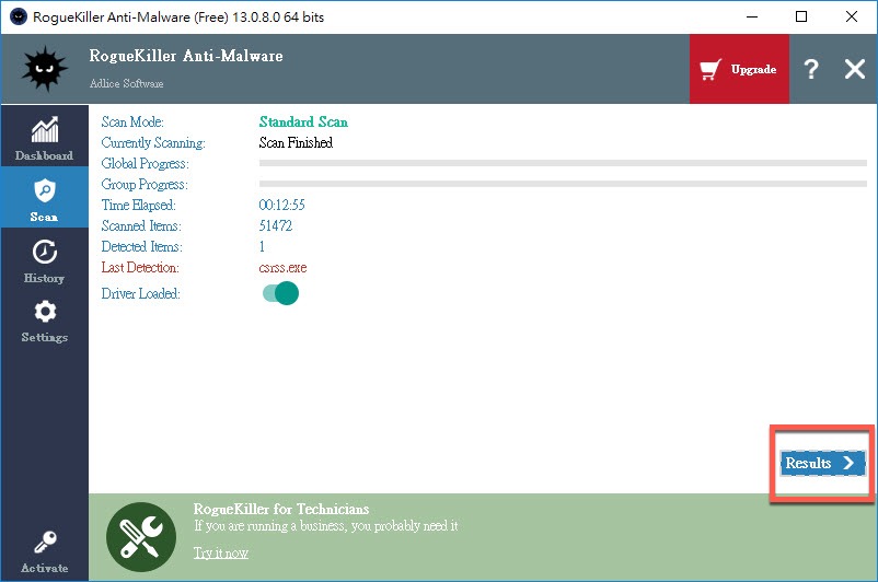 接下來會花一點時間徹底的掃描你的電腦,各種惡意程式都會被糾出來,當然就跟掃毒軟體一樣並不能保證百分之百,不過我想 9 成 5 以上的惡意程式都不會漏掉,當掃描完成後可以點擊 Results 來看看結果。