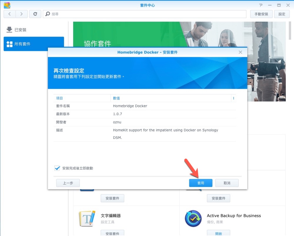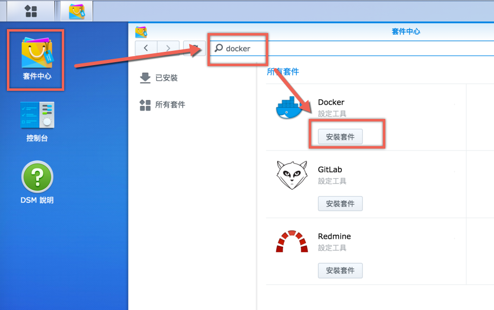 首先登入到你的 NAS,在套件中心搜尋 docker,然後安裝套件,原則上我們就是透過 Docker 的方式,不過我們只需要將 Docker 安裝好不需要進去設定。